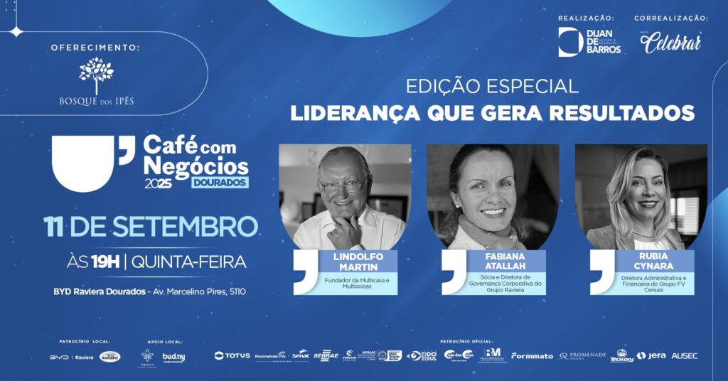 O Café com Negócios realiza, no dia 11 de setembro, às 19h, sua segunda edição em Dourados/MS, na BYD (Av. Marcelino Pires, 5.110 – Vila Industrial). Com o tema “Liderança que Gera Resultados”, o encontro reunirá líderes empresariais para discutir estratégias de gestão, desenvolvimento de equipes e processos que impactam diretamente os resultados das empresas.